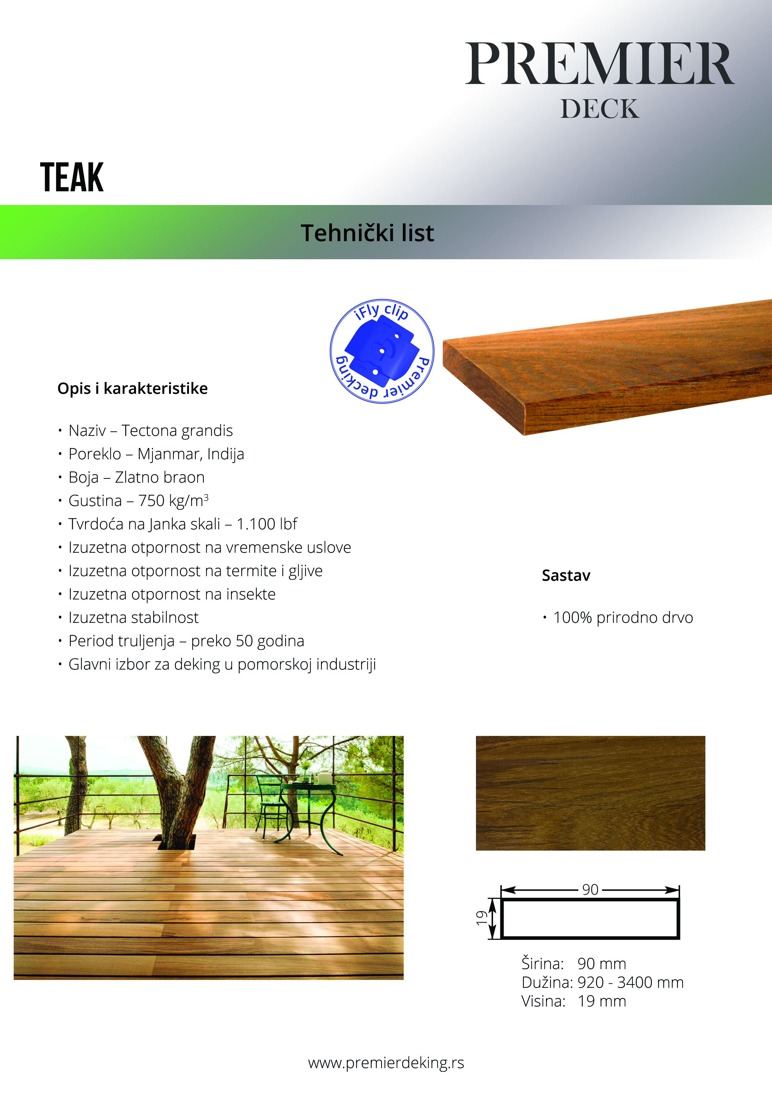 Tik nema alternativu, to je najcenjenije drvo u svetu. Karakteriše ga zlatno-braon boja, izuzetna stabilnost, otpornost na vremenske uslove, kao i jedinstven estetski izgled koji daje dizajnerima beskonačne mogućnosti.