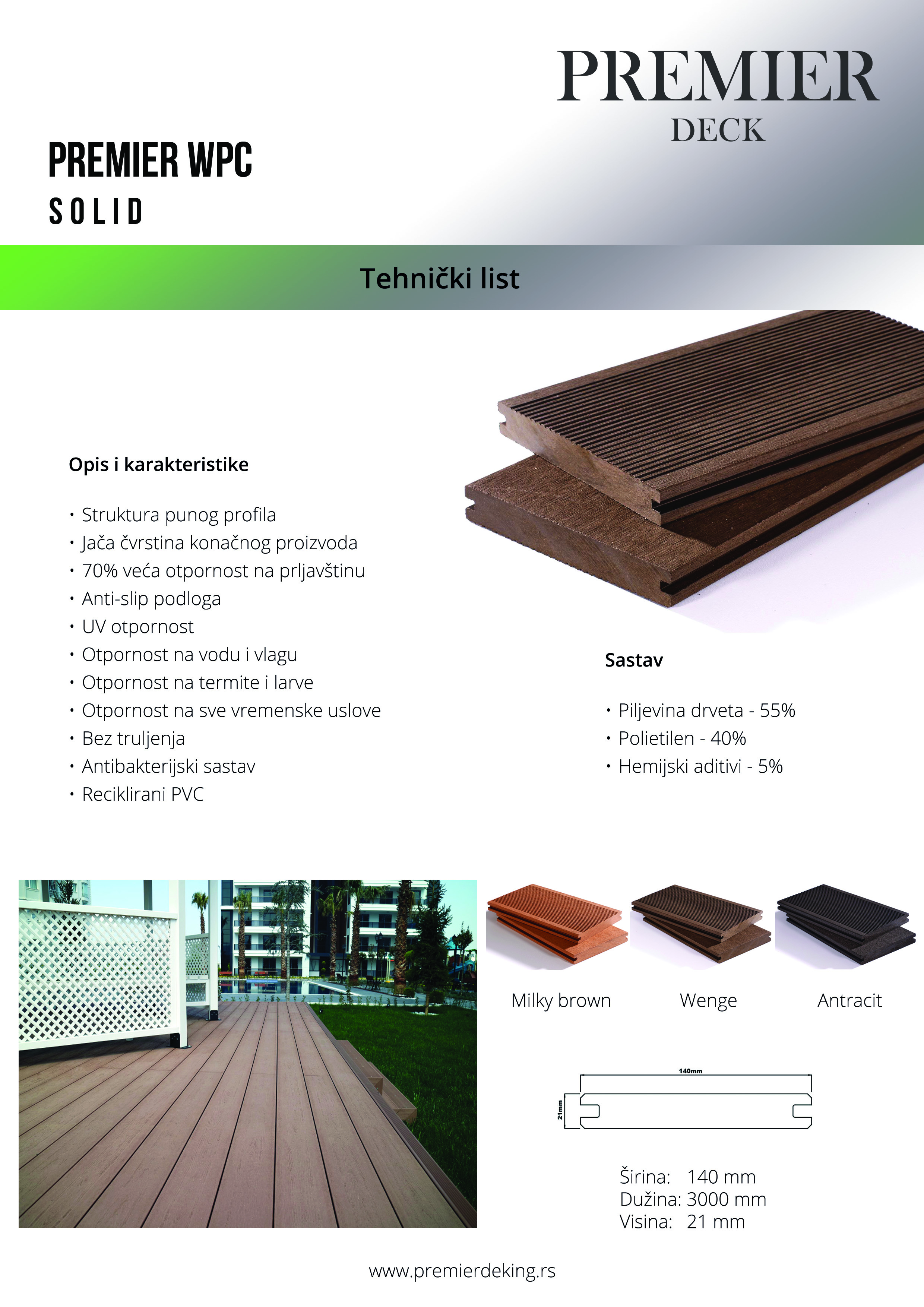 Premier Vam nudi WPC SOLID rešenje koje karakteriše pun profil daske, bez komora u sredini strukture, što omogućuje 100% tvrdoću materijala, besprekoran kvalitet uz 5-godišnju garanciju kao i potpunu sigurnost pri većem opterećenju dekinga.